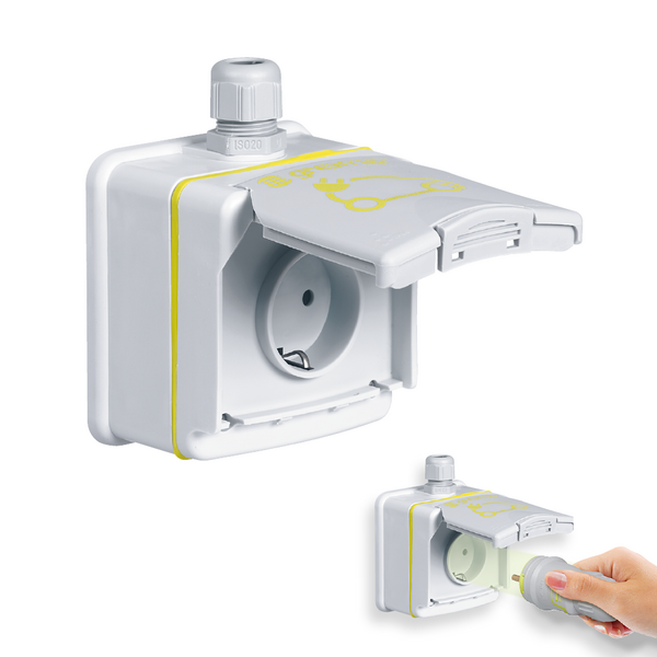 • Verstärkte, Steckdose, Robust und Wassergeschützt IP 55 (mit geschlossenem Deckel) . Entwickelt für aufladbare Elektro- und Hybridfahrzeuge
